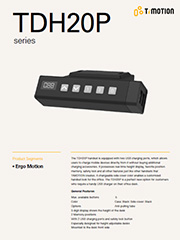 TDH20P可支持2个USB充电接口,让使用者直接充电其手持装置而无需购买其它配件。TDH20P也提供三位显示器可显示桌子高度,两组记忆位置,以及安全锁功能。侧盖可换颜色,让使用者的办公室家具更具个人特色。TDH20P提供了使用者于升降桌手控器另一个弹性的选择。它可与蓝牙配件 - TWD1搭配,透过TiMOTION开发的应用程序 - “STAND UP PLS", 由手机直接轻松地控制桌子的升降与高度。