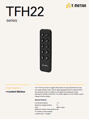 TFH22手控器内建磁铁可直接吸附于铁制的沙发椅架上。流线型外观和10颗橡胶式按钮,能够满足高阶休闲椅的各式需求。背部滑盖设计能够轻易更换电池。