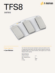 TFS8为医疗用脚控器,专为医疗用病床、牙科椅、居家看护椅及诊疗台而设计。 TFS8总共有6个按键,最多可支援3支马达。另外提供无线功能选择。