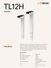 堤摩讯(TiMOTION)推出的TL12H是可支持重负载的电动升降柱产品之一。它是一款上粗下细,矩形的三节式升降立柱,单支最高可达120公斤。TL12H适用于咨询桌、工业工作桌、打包台或任何需要承载较大重量的工作桌等应用。它能与工作环境应用的控制盒和升降桌框系列相互搭配。