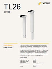 TiMOTION (堤摩讯) 的桌脚立柱系列是特别为办公桌家具及工作桌而设计。我们的桌 脚立柱产品可搭配相关控制盒及手控器,能进行安静的升降动作和桌脚同步控制。所有办 公工作环境应用所使用的控制盒均具备0.1W的待机功耗,兼具环保和节能。客户可根据 设计需求随心选择桌脚立柱系列的任一产品。 TL26 为一款外观上粗下细,矩形的两节式 升降立柱。