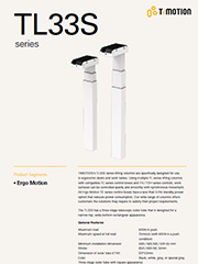 堤摩讯 (TiMOTION)的桌脚升降柱系列是特别为办公桌家具及工作桌而设计。我们的桌脚升降柱产品可搭配相关控制盒及手控器,能进行安静的升降动作和桌脚同步控制。所有工作环境应用所使用的控制盒均具备0.1W的待机功耗,兼具环保和节能。客户可根据设计需求随心选择桌脚升降柱系列的任一产品。 TL33S 为一款外观上细下粗,矩型的三节式升降柱。