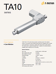 TA10的最大产品特色为具备手摇下端,可利用此一装置控制推杆动作﹔针对供电不稳的环境,或者突然断电的状况,TA10可以利用其手摇装置来取代电动功能。在医疗应用上,TA10的价格极具竞争力,是在众多医疗推杆产品中,另外一个绝佳选择。