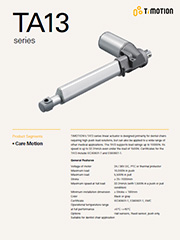 TA13是针对需要较强推力的牙科椅应用而设计,但亦适用于其它医疗产品。 TA13的负载最大可至10000N。在负载1500N的情况下,速度可至32.2mm/s。其医疗认证包含IEC60601-1及ES60601-1。