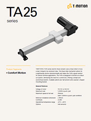 - 电动升降立柱: TiMOTION(第一传动)制造升降立柱为满足工业、医疗及人体工学的市场。电动立柱主要优势为垂直升高负荷的能力,同时保持高度稳定及弯曲移动。