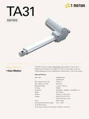 TA31是堤摩讯(TiMOTION) 开发的新一代医疗电动直线推杆之一。其负载最高可承重8000N,且防水等级可达IP66W。 TA31适用于各项医疗产品,如电动医疗病床,浴室椅或居家医疗床等产品。