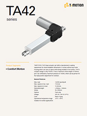 堤摩讯 (TiMOTION) 所开发的TA42家具电动直线推杆,能满足制造商对于家用座椅设计要求安装空间小的需求。少了马达外壳相对也节省了休闲椅上所需要的安装空间。TA42的安装尺寸仅100mm。行程最长可至200mm,负载可达到1500N,是休闲椅调整头部位置的最佳电动推杆选择。