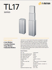 Le colonne di sollevamento elettriche serie TL17 di TiMOTION sono specificamente progettate per applicazioni medicali. Grazie alla sua struttura rettangolare in alluminio estruso, la colonna di sollevamento TL17 assicura un alto livello di stabilità. La concezione telescopica a 3 sezioni riduce notevolmente l'altezza di ingombro e offre una eccezionale lunghezza della corsa.